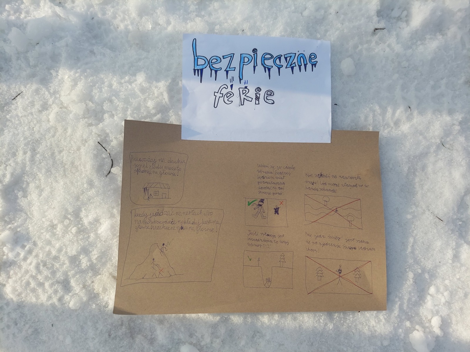 Rozumiemy i stosujemy zasady związane z bezpiecznym zachowaniem się podczas ferii zimowych. Bezpieczeństwo w ruchu drogowym: Używanie elementów odblaskowych, szczególnie po zmroku. Rozważne przechodzenie przez ulicę, zwracanie uwagi na dłuższy czas hamowania na oblodzonych drogach. Unikanie zabaw przy drogach i zjeżdżania na sankach w ich pobliżu. Bezpieczeństwo na śniegu i lodzie: Zabawa tylko na wyznaczonych i bezpiecznych terenach (placach, lodowiskach).Zakaz wchodzenia na zamarznięte jeziora, stawy i rzeki. Unikanie rzucania śnieżkami w pojazdy, ludzi lub śnieżkami z twardymi przedmiotami. Nie strącamy sopli i unikamy niestabilnych konstrukcji ze śniegu. Kulig może być organizowany tylko przez dorosłych i poza obszarem dróg publicznych. Bezpieczeństwo osobiste i higiena: