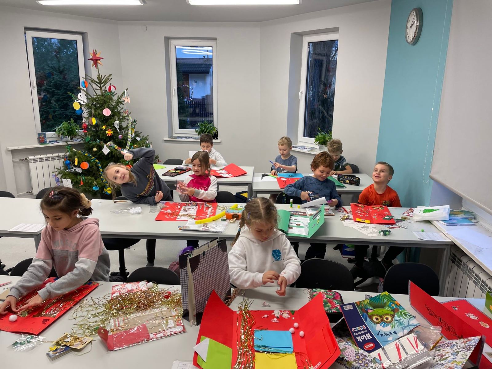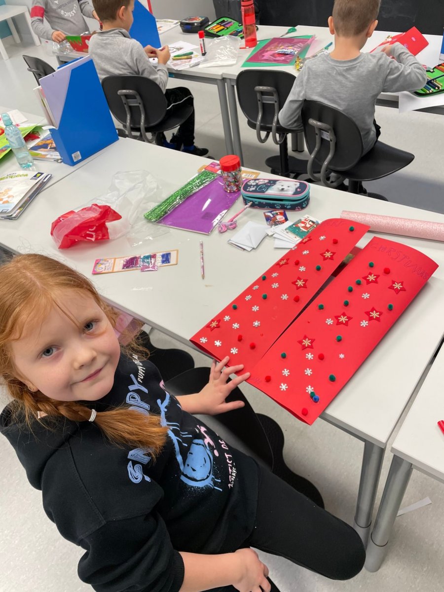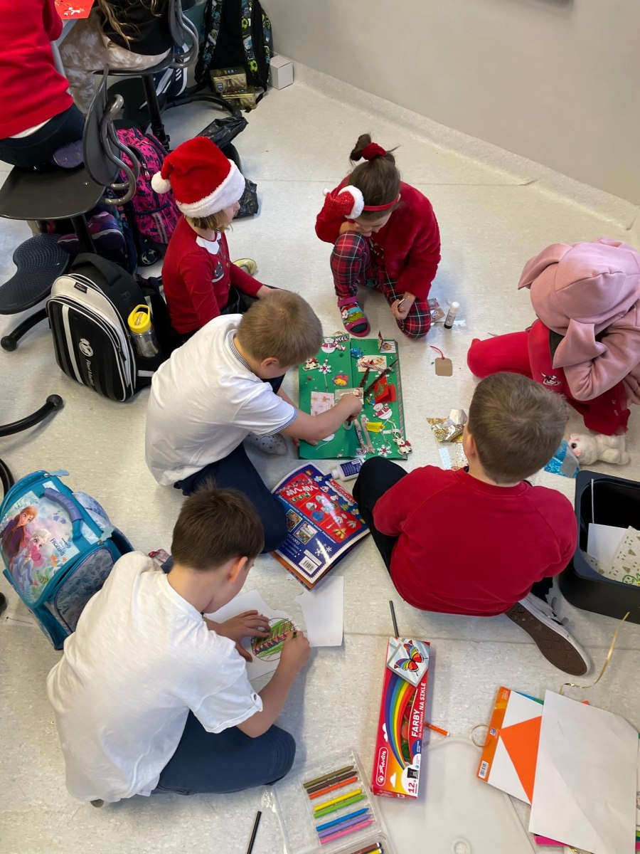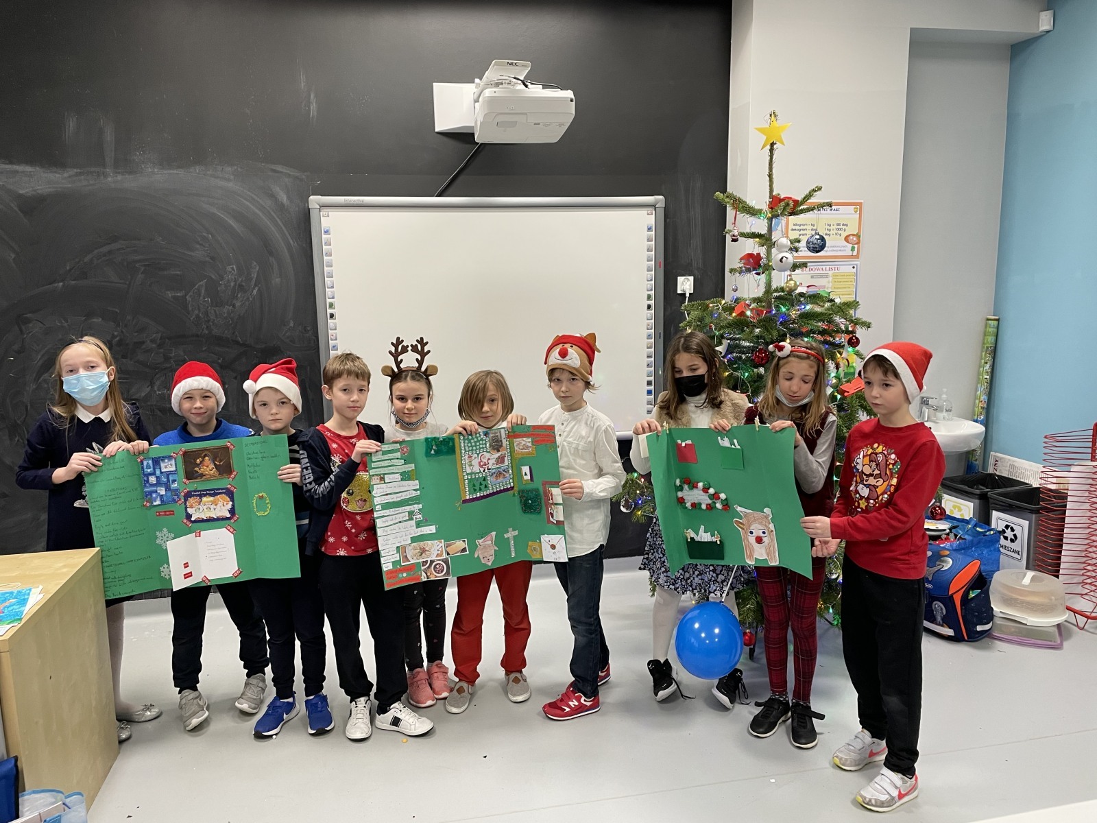 Klasy 1-3 tworzyły lapbooki o tematyce świątecznej. Uczniowie mieli okazje utrwalić słownictwo, porozmawiać o tradycjach świątecznych. Przed trybem zdalnym mieli szansę zrobić coś wymagającego dobrych umiejętności manualnych dobrze się przy tym bawiąc.
