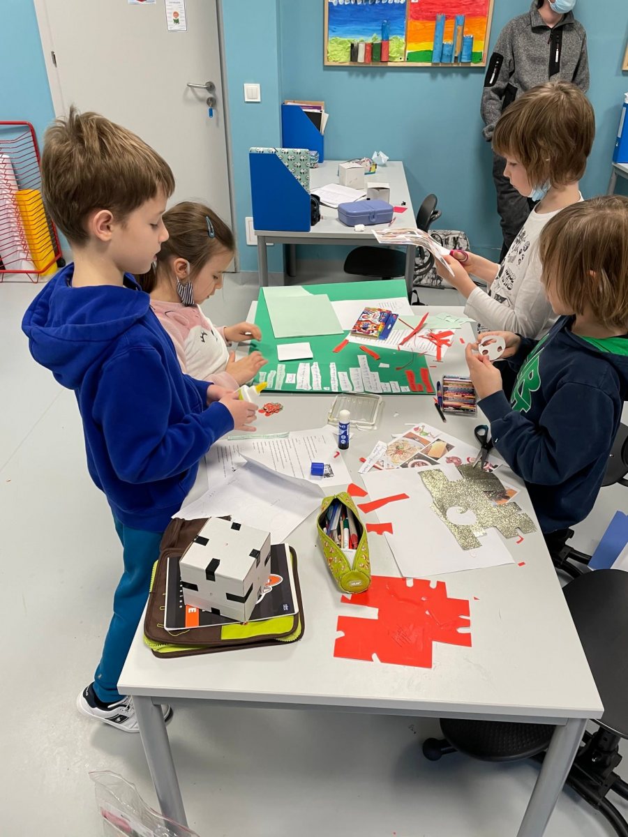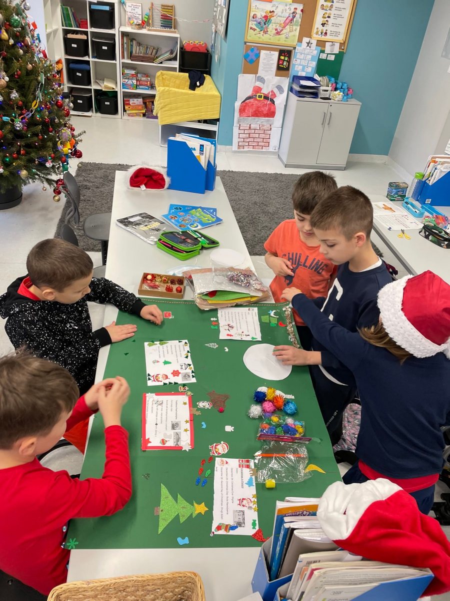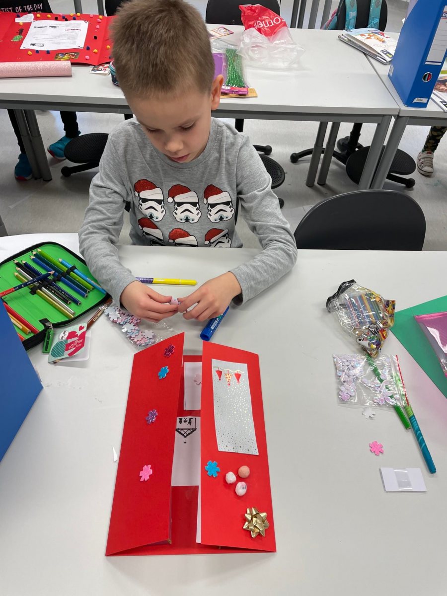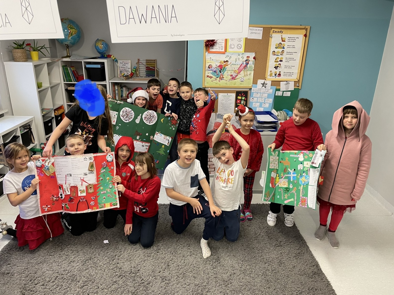 Klasy 1-3 tworzyły lapbooki o tematyce świątecznej. Uczniowie mieli okazje utrwalić słownictwo, porozmawiać o tradycjach świątecznych. Przed trybem zdalnym mieli szansę zrobić coś wymagającego dobrych umiejętności manualnych dobrze się przy tym bawiąc.