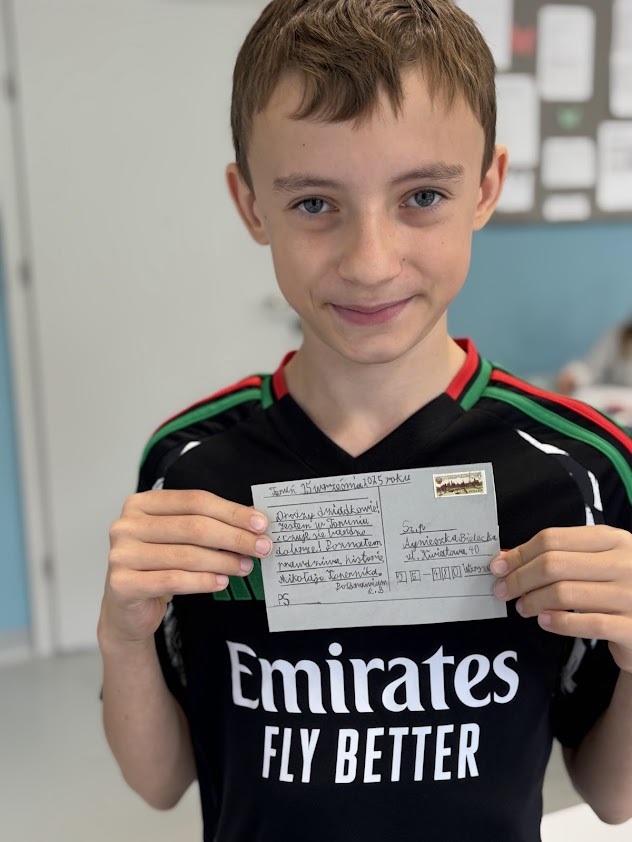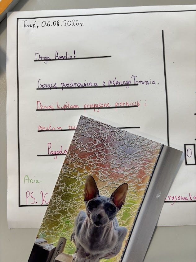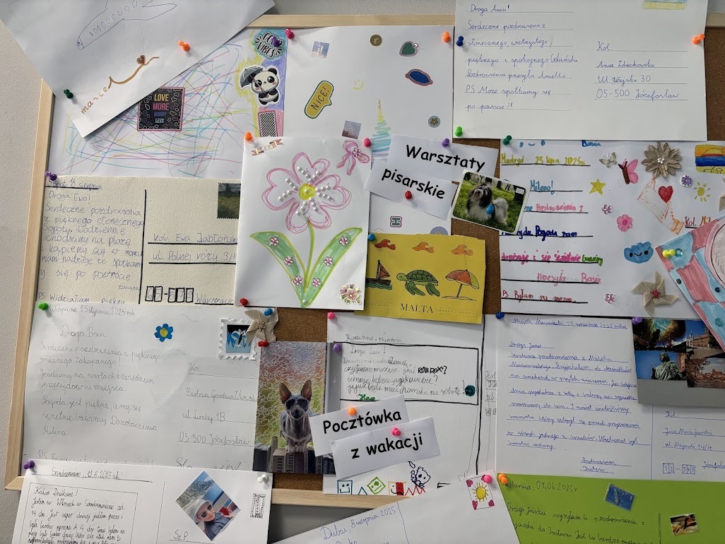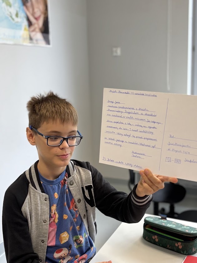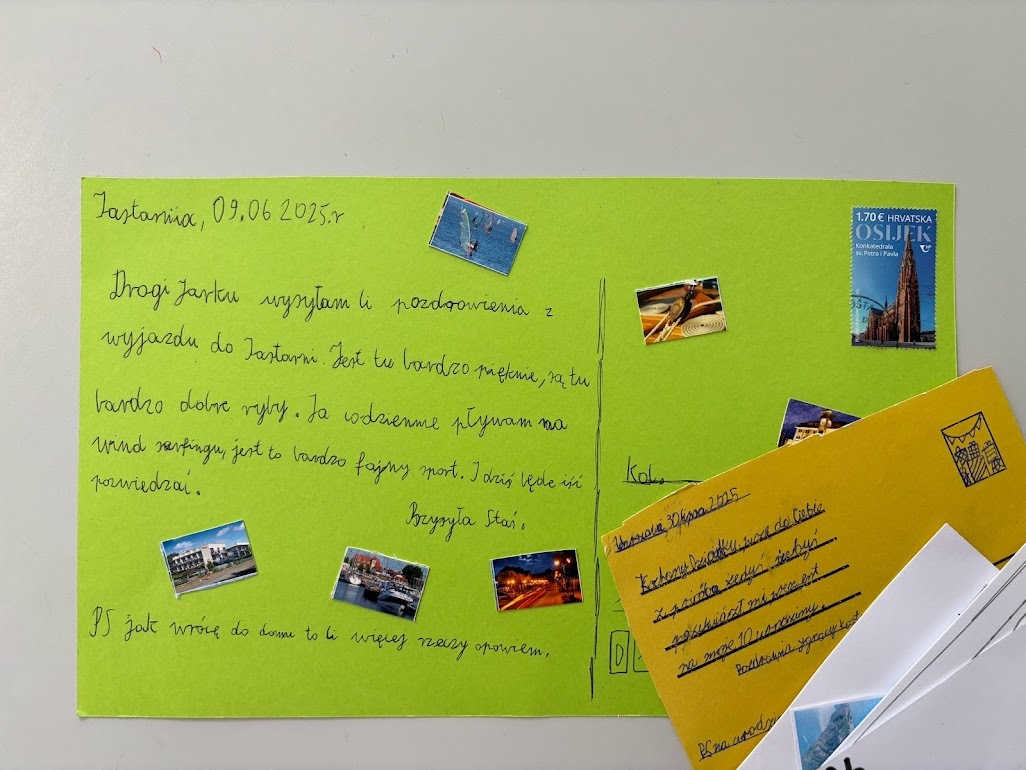 Jedną nogą w szkole, drugą jeszcze na wakacjach…. Razem z czwartoklasistami powtórzyliśmy wiadomości na temat życzeń i pozdrowień. Jak adresować pocztówki, co na nich napisać, czemu służy taka forma korespondencji? A wszystko to w atmosferze wspomnień o lecie i czasie wolnym.