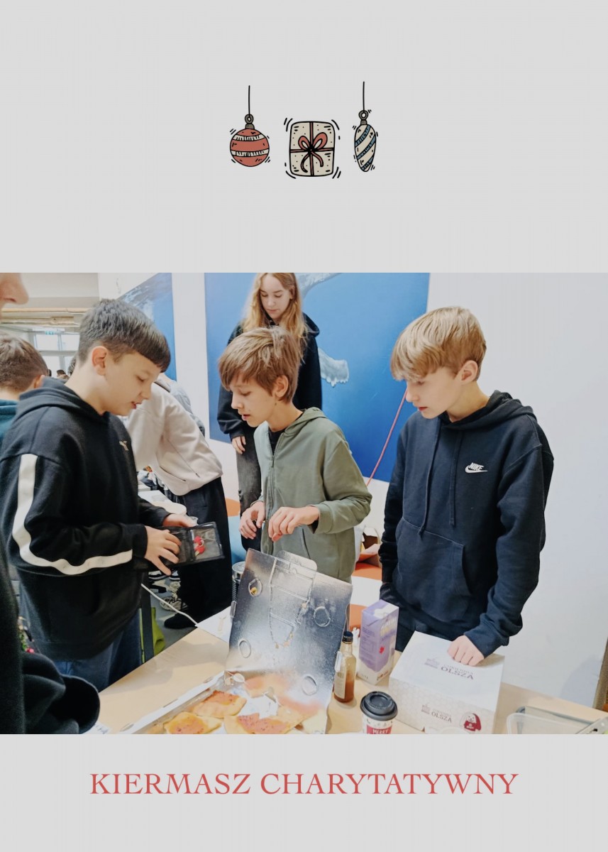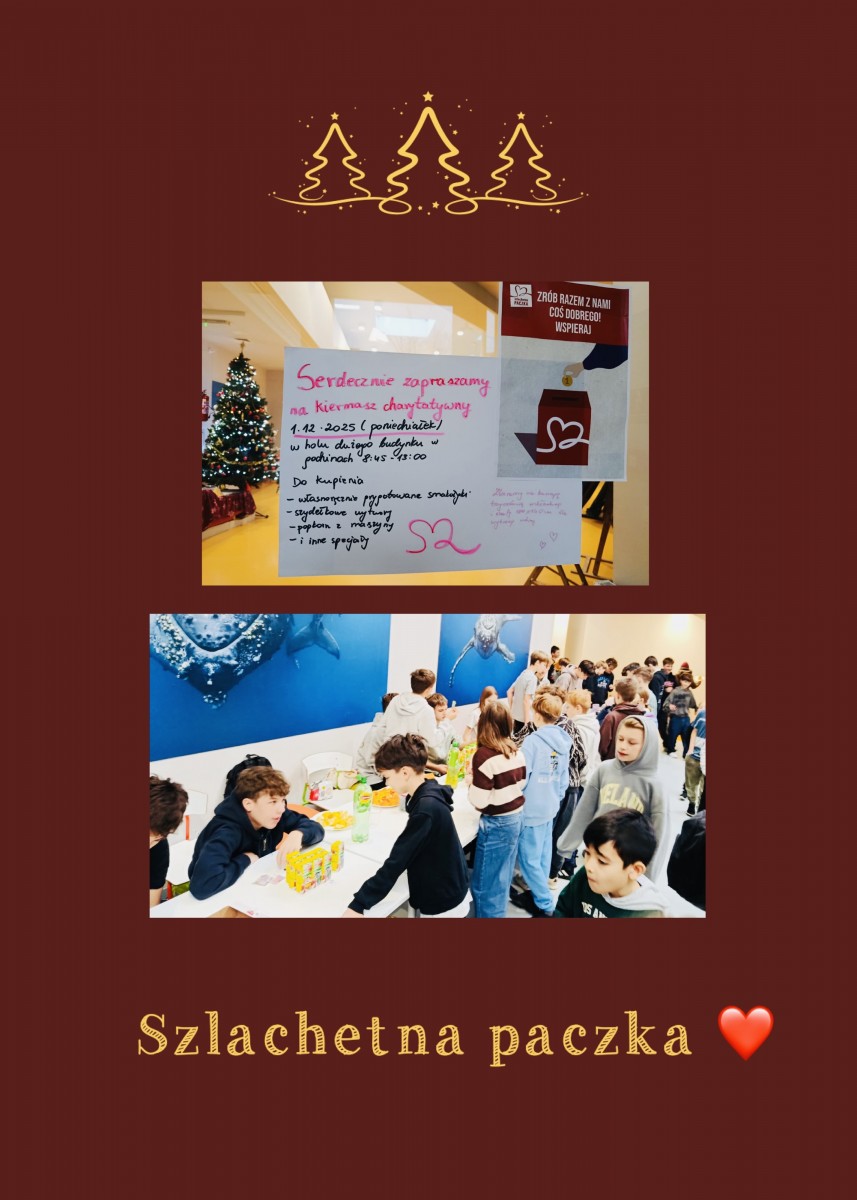 Jak co roku uczniowie klas starszych organizują kiermasz charytatywny w celu uzbierania kwoty potrzebnej do zakupu większej rzeczy dla rodziny wybranej w ramach akcji Szlachetna Paczka. W tym roku jest to sofa rozkładana i szafa. W asortymencie sprzedawanym były zarówno pyszne ciastka i ciasteczka, popcorn z maszyny, lemoniada i inne pyszności. Szydełkowe pluszaki i breloki. Bardzo dziękujemy wszystkim zaangażowanym w kiermasz osobom. Zarówno tym co sprzedawali jaki tym co dokonali zakupów. Pamiętajmy dobo wraca!