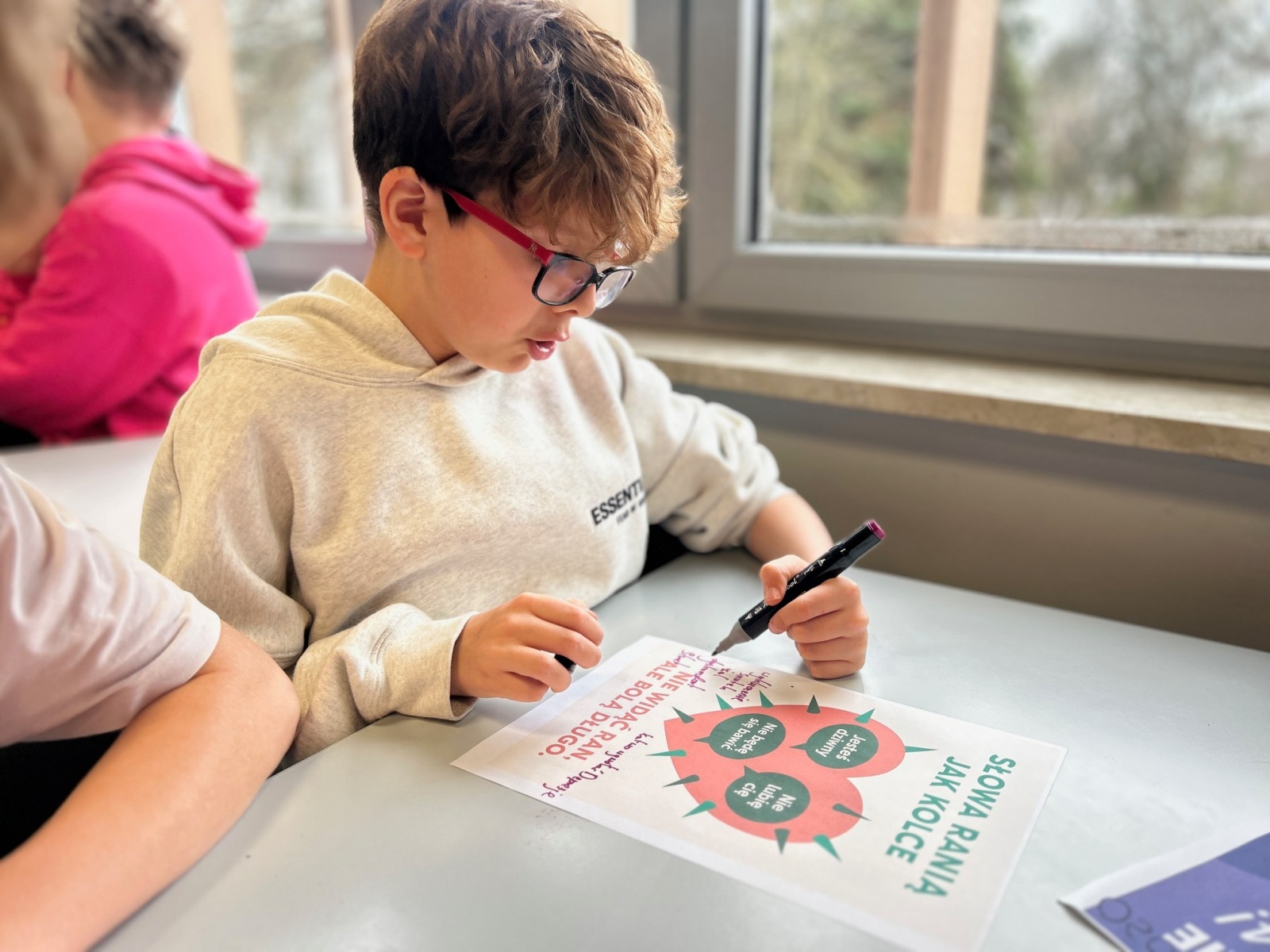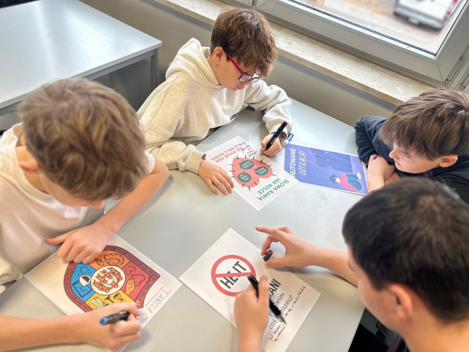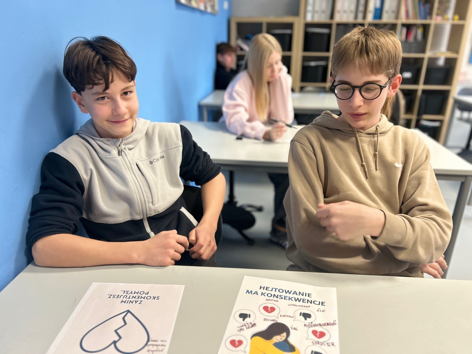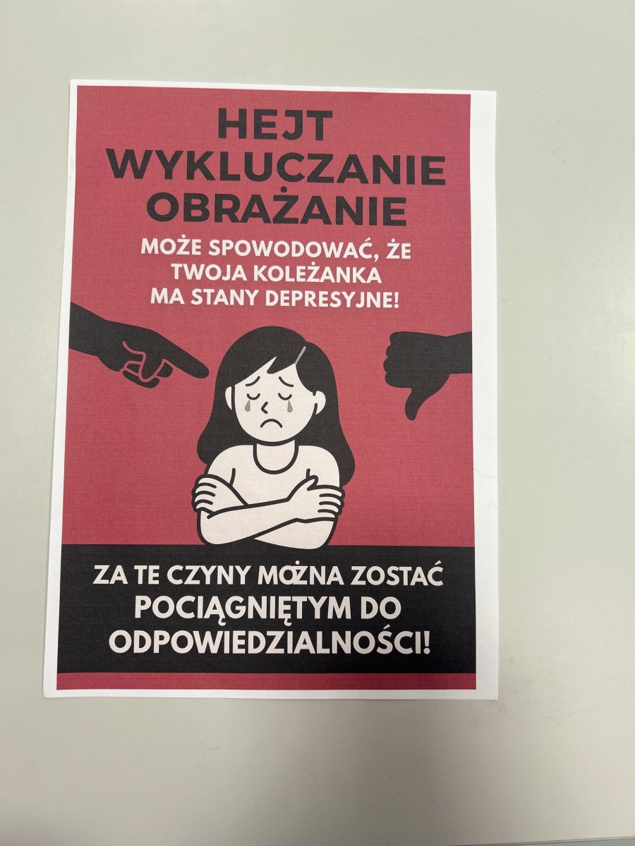 Uczniowie klasy 8A uczestniczyli dziś w warsztacie w ramach innowacji pedagogicznej „Moje wartości – mój kompas”. Tematem przewodnim spotkania była „Odpowiedzialność Społeczna”. Podczas zajęć młodzież wcielała się w rolę ucznia wykluczonego, hejtowanego, zastraszanego i pomawianego. Dzięki tej symulacji mogli lepiej zrozumieć emocje osób doświadczających trudnych sytuacji oraz uświadomić sobie, jakie konsekwencje także prawne niesie za sobą nieodpowiednie zachowanie w szkole, w środowisku lokalnym i w Internecie. Warsztat był okazją do refleksji nad wartościami, które powinny kierować codziennymi wyborami młodych ludzi, a także do rozmowy o tym, jak budować bezpieczną i wspierającą społeczność szkolną.