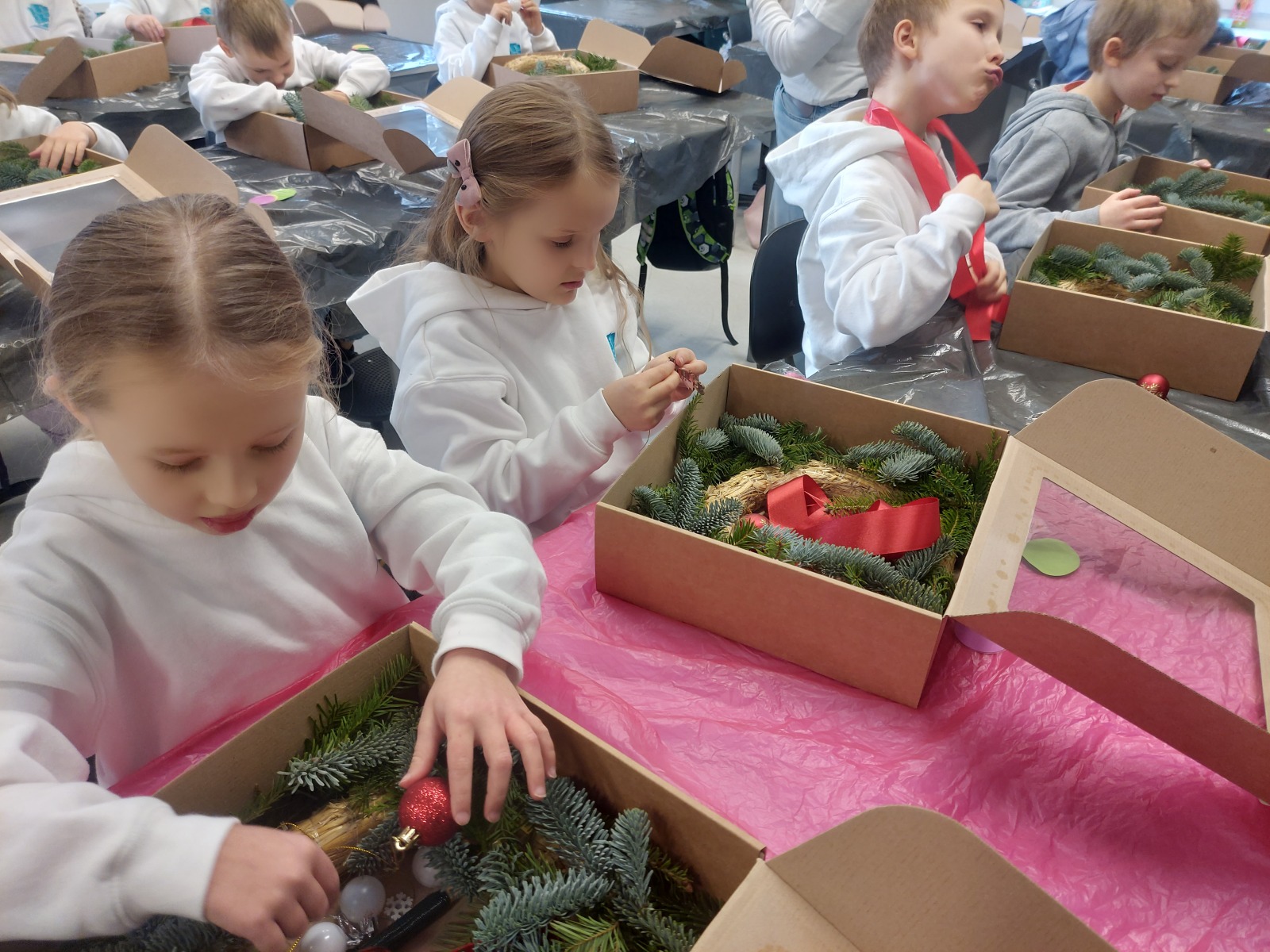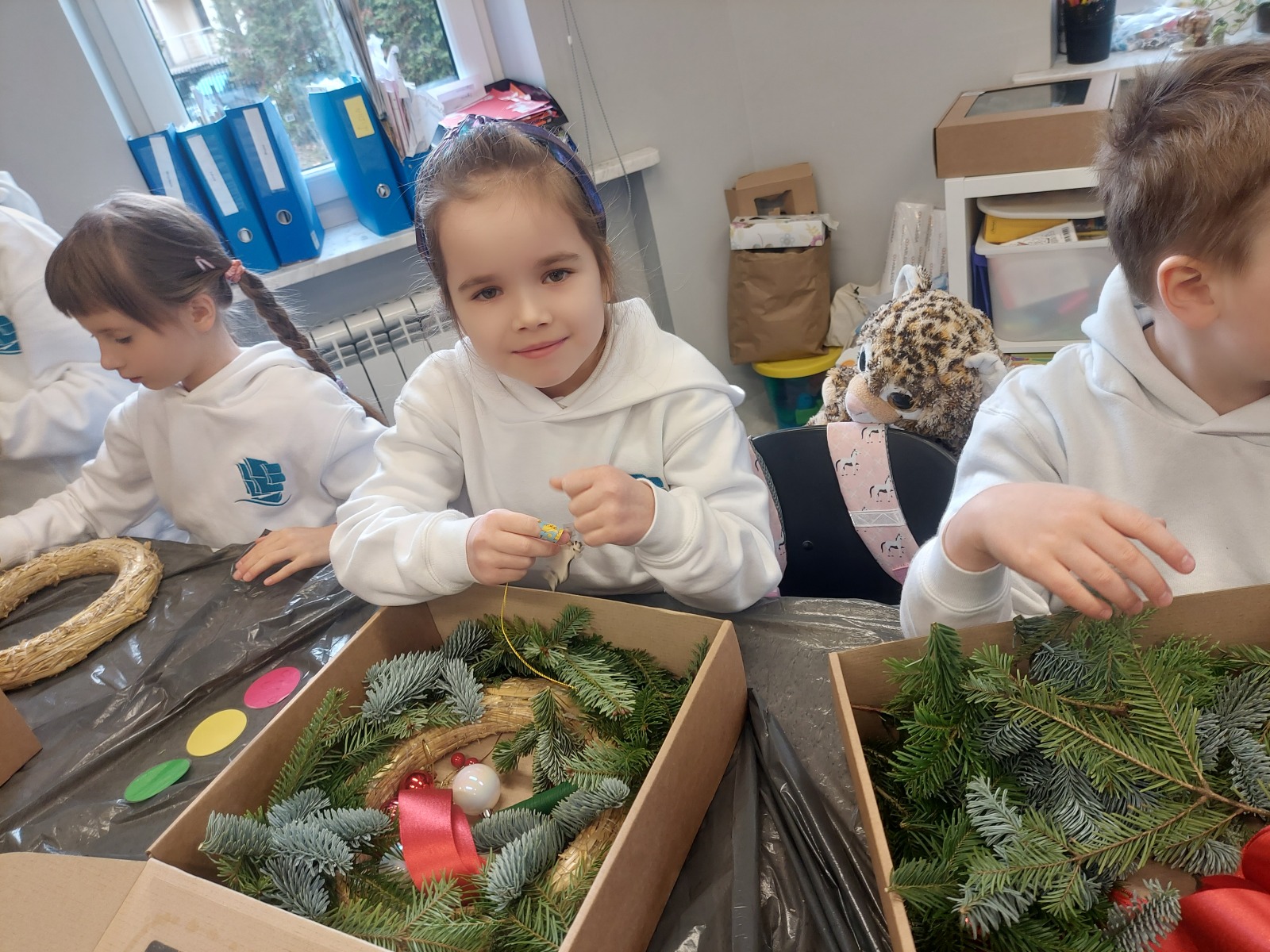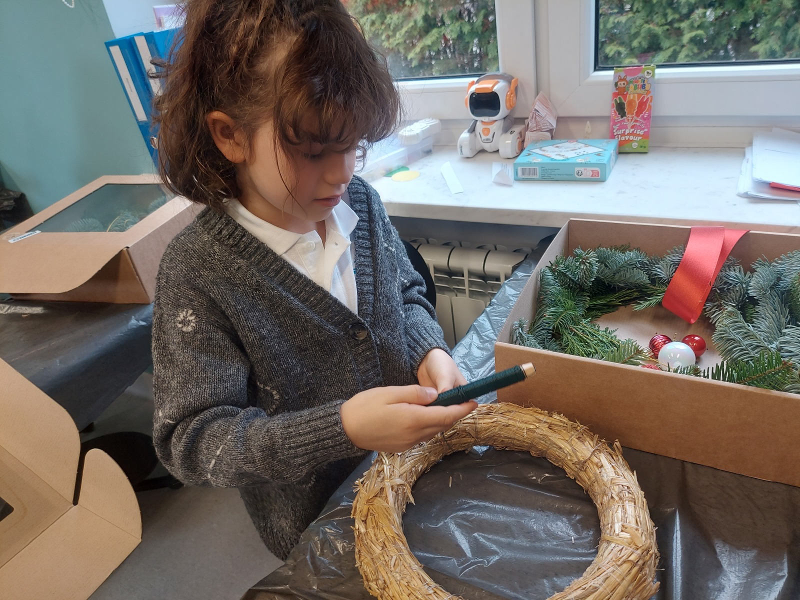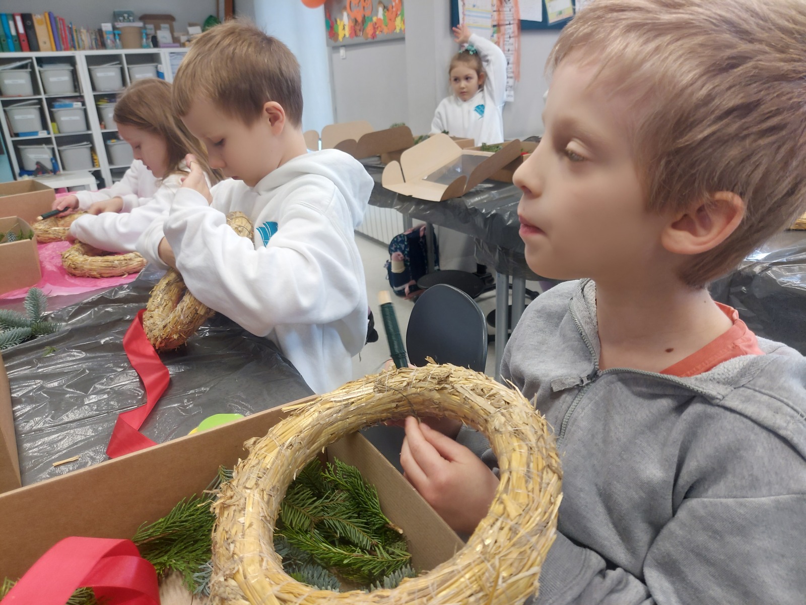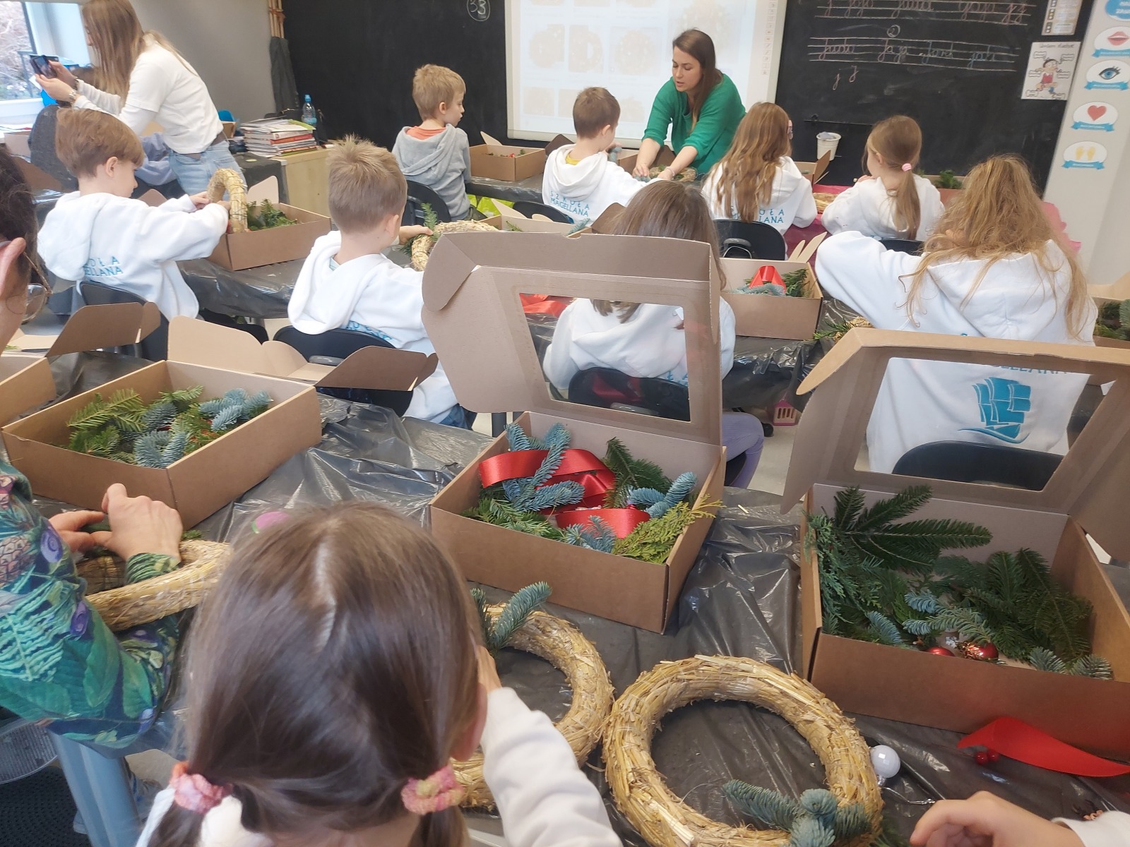 W związku ze zbliżającym się okresem świątecznym uczniowie klasy IA wykonali własnoręcznie przepiękne wieńce. Do pracy wykorzystali gotowe, okrągłe bazy oraz gałązki iglaste – m.in. świerku i sosny – które nadawały kompozycjom naturalny, zimowy charakter. Każdy wieniec został ozdobiony według pomysłu uczniów: kolorowymi bombkami, kokardkami, szyszkami i innymi dekoracjami. Powstały wyjątkowe, pełne uroku świąteczne ozdoby z prawdziwego ducha kreatywności – prawdziwe wieńcowe arcydzieła 🙂