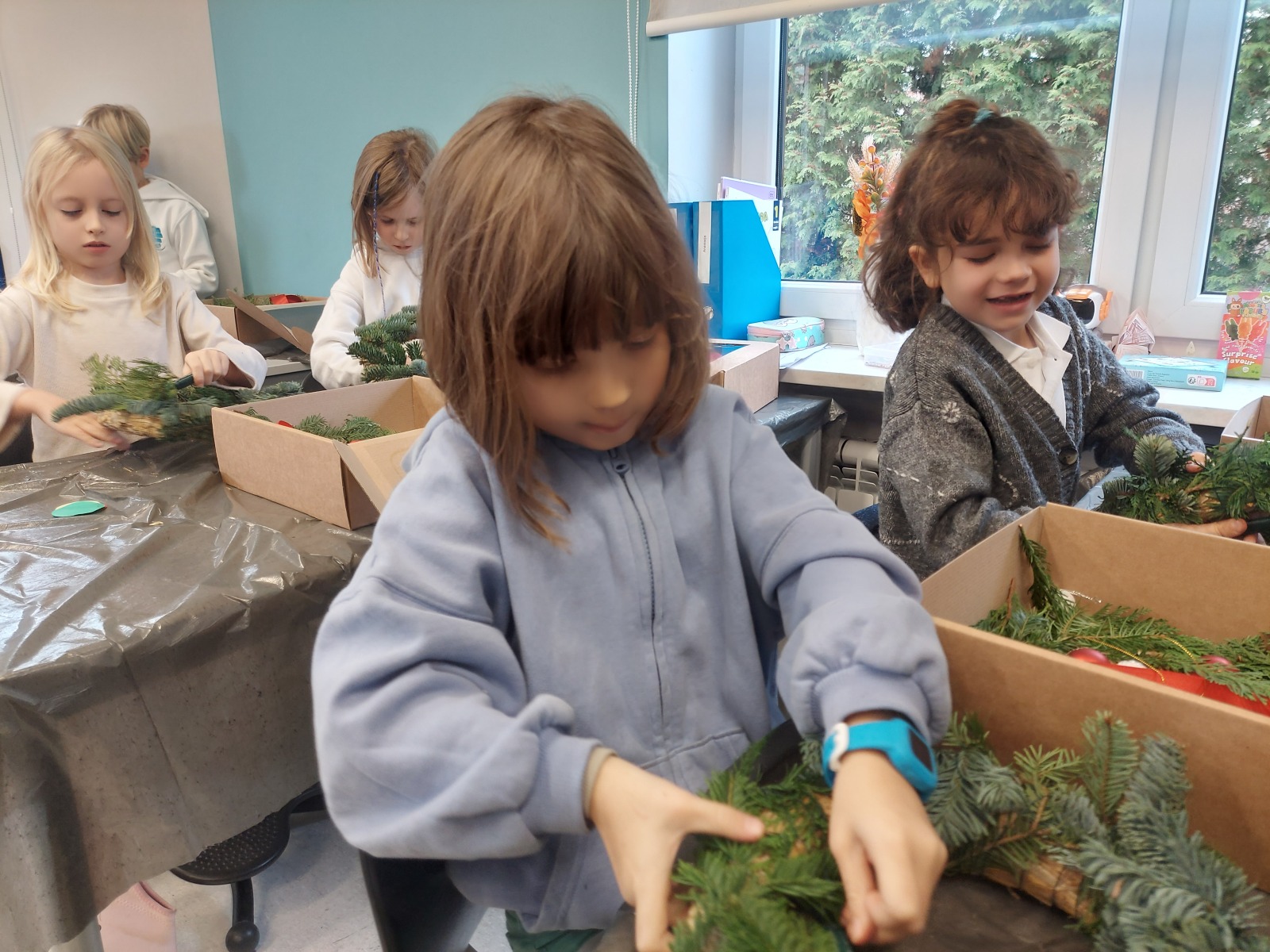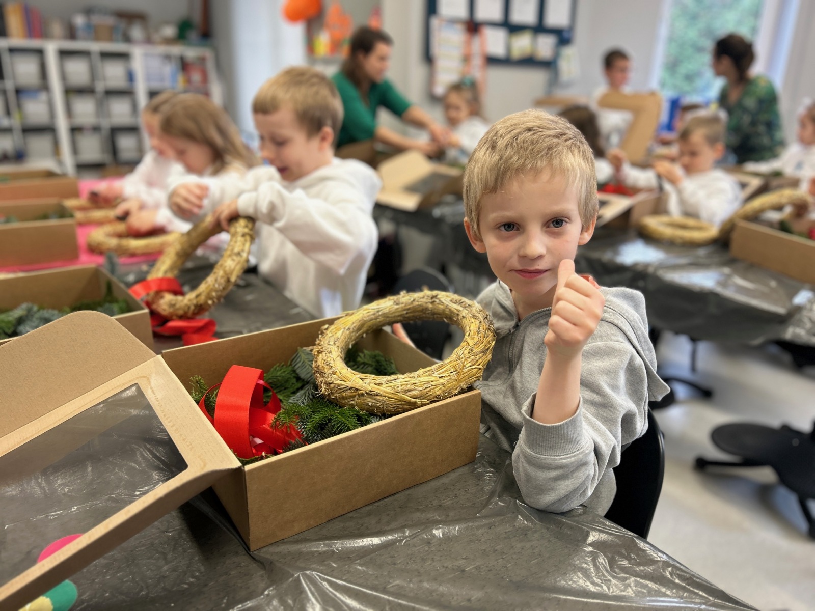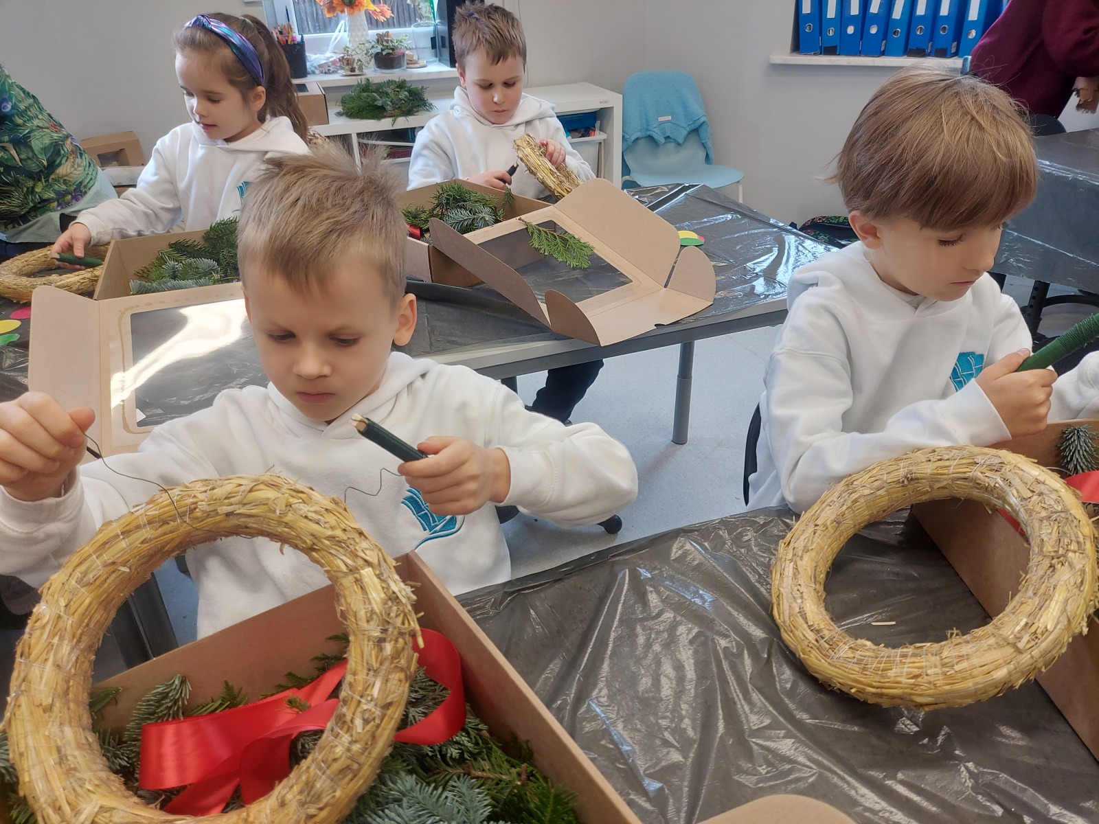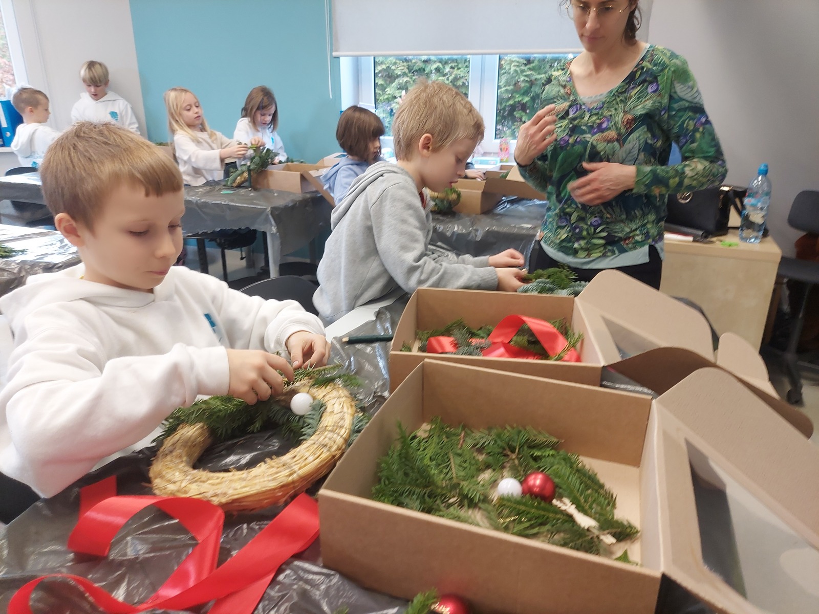 W związku ze zbliżającym się okresem świątecznym uczniowie klasy IA wykonali własnoręcznie przepiękne wieńce. Do pracy wykorzystali gotowe, okrągłe bazy oraz gałązki iglaste – m.in. świerku i sosny – które nadawały kompozycjom naturalny, zimowy charakter. Każdy wieniec został ozdobiony według pomysłu uczniów: kolorowymi bombkami, kokardkami, szyszkami i innymi dekoracjami. Powstały wyjątkowe, pełne uroku świąteczne ozdoby z prawdziwego ducha kreatywności – prawdziwe wieńcowe arcydzieła 🙂