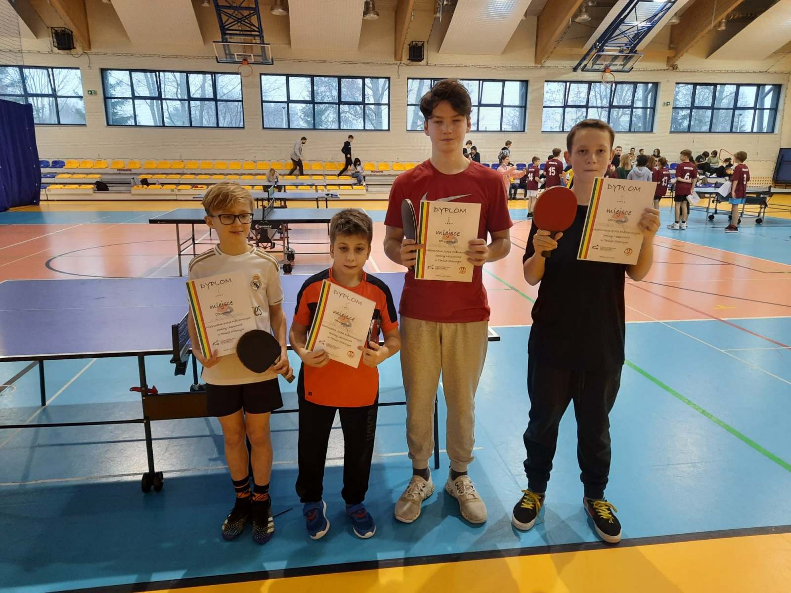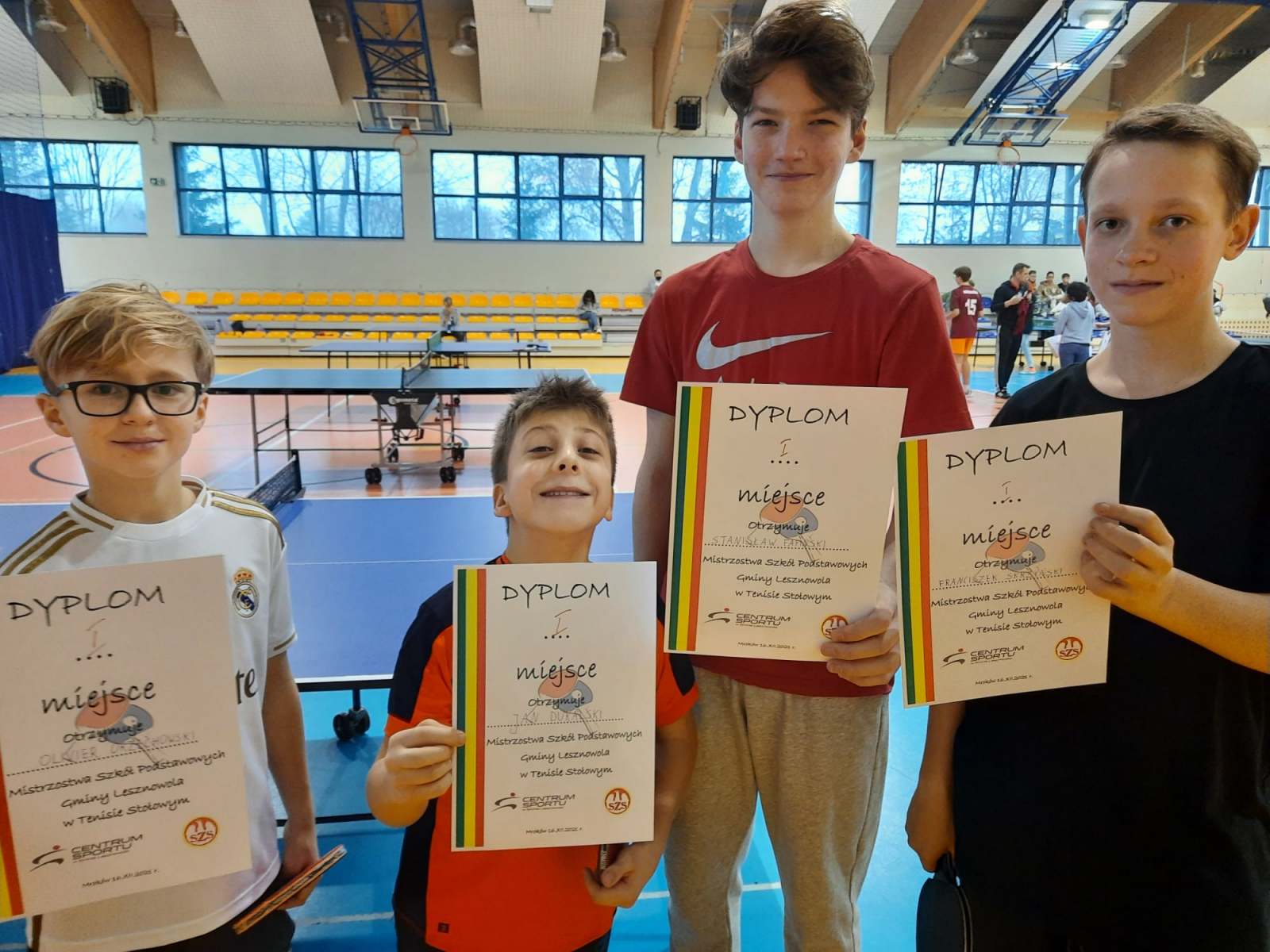 Wspaniały prezent pod choinkę sprawili sobie nasi reprezentanci. Obie nasze startujące ekipy zwyciężyły we wszystkich spotkaniach i tym samym zajęły I miejsce w swoich kategoriach w gminnym turnieju w tenisie stołowym. Młodsza drużyna z kategorii 2009 i młodsi: Jaś D. i Olivier O. klasa 5A. Starsza drużyna z kategorii 2007: Staś F. i Franek S. klasa 8W. Obie ekipy będą reprezentowały szkołę oraz gminę na szczeblu powiatowym.