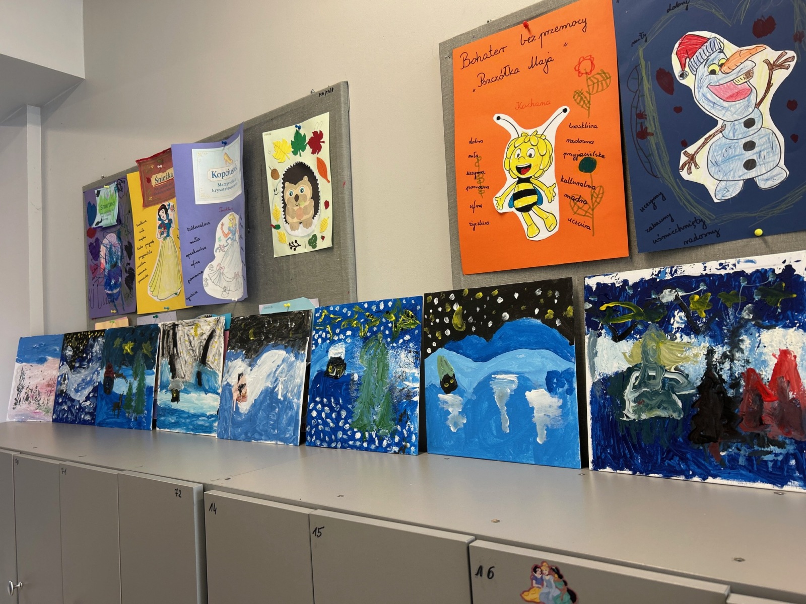 Uczniowie z klasy 1A na zajęciach plastyki, inspirowani obejrzanym filmem i wskazówkami nauczyciela, stworzyli piękne zimowe pejzaże. Ich prace pełne są śnieżnych krajobrazów i magicznej atmosfery zimy. Prace uczniów można podziwiać na szkolnym hotelu w małym budynku.
